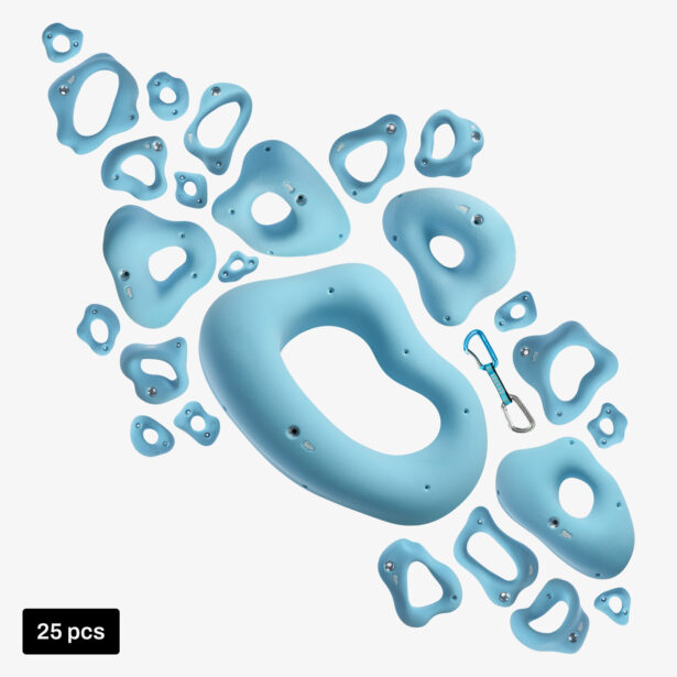 Klettergriffe Lagunas bilden ein Boulder Kit für kraftvolle Boulder an überhängenden Wänden. Dominante große PU-Makros kombiniert mit positiven Jugs und Tritten ermöglichen auffällige und gut lesbare Boulderprobleme.